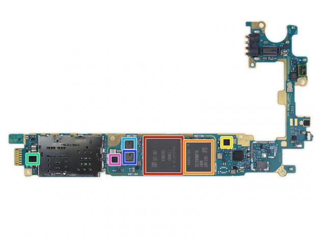 Màu đỏ: RAM 4 GB đến từ Samsung ở trên và bên dưới là bộ vi xử lý Snapdragon 820 do Qualcomm sản xuất