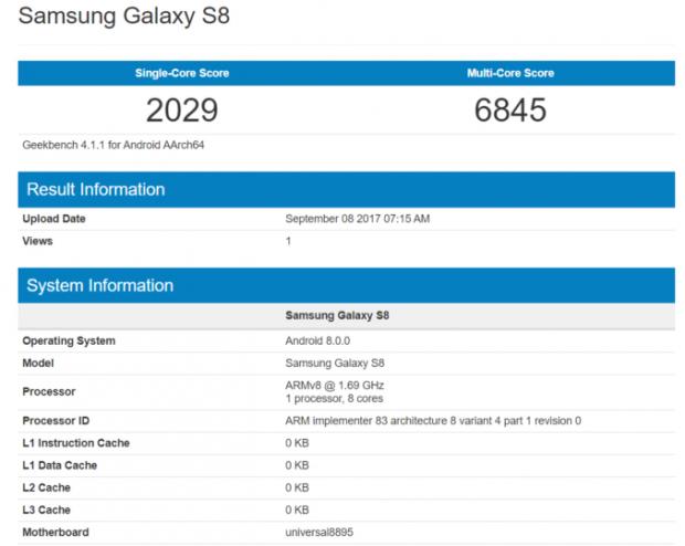 Bây giờ, theo Sammobile, một chiếc Galaxy S8 đã được phát hiện trên Geekbench đang chạy hệ điều hành Android 8.0. Hình ảnh này thực ra được phát hiện bởi GalaxyClub và bạn có thể thấy thông tin về chiếc Galaxy S8 đang chạy Android 8.0 trong hình ảnh bên dưới đây.