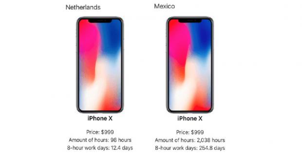 Trang web của Felipe giúp bạn dễ dàng so sánh số ngày làm việc của người dân ở các nước với nhau để mua được iPhone X mới nhất. Chẳng hạn như ta có Hà Lan và Mexico. Trong khi ở Hà Lan, bạn sẽ phải mất khoảng 12 ngày, tám tiếng đồng hồ / ngày với mức lương tối thiểu để mua iPhone X 64GB thì ở Mexico, người dân sẽ phải 255 ngày làm việc trong cùng điều kiện, do mức lương tối thiểu thấp chỉ khoảng 0,49 USD / h. Vâng, đó là hơn hai phần ba số công việc của một năm chỉ để mua một chiếc điện thoại!