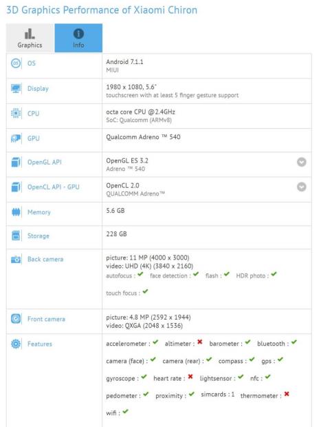 Ngoài ra, theo hình ảnh rò rỉ từ trang GFXBench thì Xiaomi Chiron sẽ sở hữu cấu hình cực khủng bao gồm vi xử lý Snapdragon 835, xung nhịp 2.4GHz, đi kèm là đồ họa Adreno 540, dung lượng RAM lên đến 6GB và người dùng sẽ có 256GB bộ nhớ trong để lưu trữ dữ liệu.