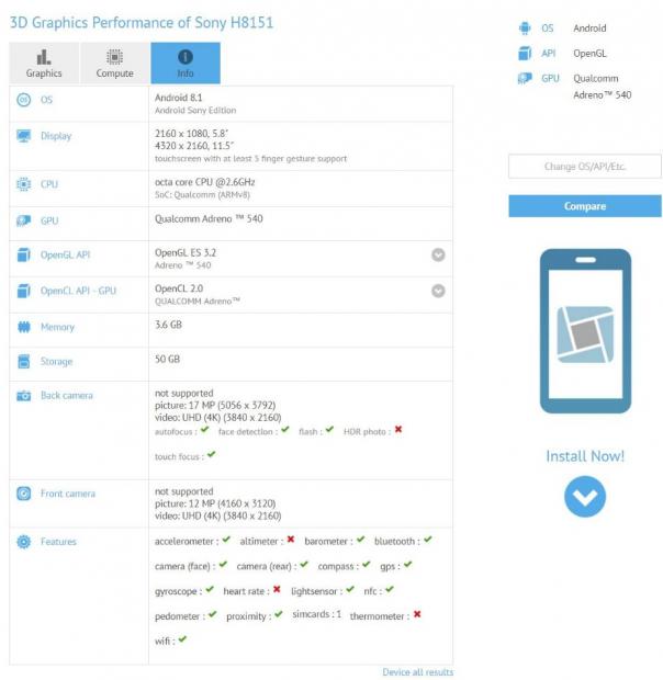 Tìn đồn này càng được củng cố hơn khi mới đây, một điện thoại thông minh mới của Sony vừa được phát hiện trên trang GFXBench với tên mã H8151. Tại đây, thiết bị được phát hiện sử dụng dụng màn hình hiển thị 5.8 inch, sử dụng tỉ lệ 18:9 với độ phân giải Full-HD+ (2.160 x 1.080 pixels).