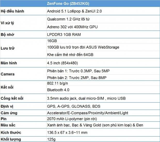 Về cấu hình, Asus Zenfone Go (ZB452KG) được trang bị màn hình 4,5 inch độ phân giải 854x480 px,vi xử lý Qualcomm Snapdragon lõi tứ tốc độ 1,2GHz, RAM 1GB, bộ nhớ trong 8GB, và dung lượng pin 2070 mAh. Máy chạy hệ điều hành Android 5.1 Lollipop với giao diện tùy biến ZenUI 2.0.