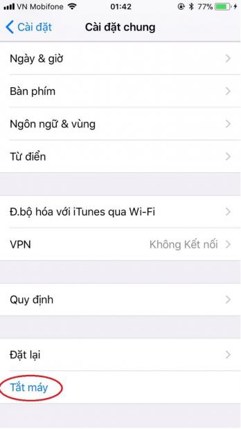 Dành cho những bạn lỡ phá đi nút vật lý của máy hoặc muốn bảo vệ nó, Apple đã tích hợp sẵn nút tắt nguồn ngay trong phần cài đặt. Khá bất tiện hơn các máy Android luôn sẵn có ở bên ngoài hay thanh công cụ, hoặc ở ngay nút home trên màn hình của iPhone. Các bạn vào phần Cài Đặt, mục Cài Đặt Chung và chọn Tắt Máy. Nhưng dù sao thì tắt bằng phím home vẫn lợi hơn mà!