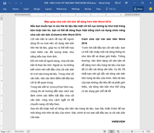 Chia cột văn bản dễ dàng hơn trên Word 2016