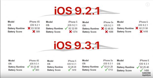 Như thường lệ, kênh YouTube iAppleByte tiếp tục đăng tải đoạn video so sánh thời lượng pin iOS 9.2.1 với iOS 9.3.1 trên nhiều mẫu iPhone khác nhau, bao gồm iPhone 4s, iPhone 5, iPhone 5s và iPhone 6.