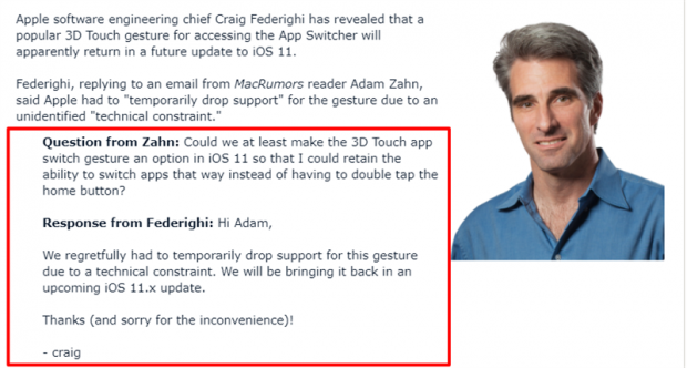 Craig Federighi trả lời email của Adam Zahn (độc giả của Macrumors) về sự trở lại của 3D Touch trên iOS 11Theo đó, trang Macrumors cũng đã xác minh cuộc trao đổi qua email trên là có thật thông qua mail server có dải địa chỉ IP được liên kết với trụ sở chính của Apple ở Cupertino, California. Chưa hết, về phía Federighi cũng từng trả lời một số email của khách hàng kể từ sự kiện ra mắt iPhone X vào tuần trước, cho nên sự trở lại của 3D Touch là rất có khả năng.