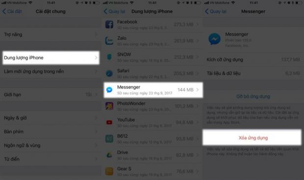 Cách 2: Vào Cài đặt > Cài đặt chung > Dữ liệu ứng dụng > Messenger > Xoá ứng dụng là xong.