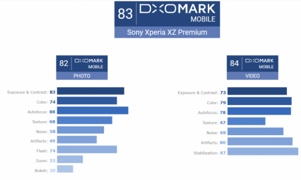 Cụ thể, Xperia XZ Premium bị DxOMark hạ điểm camera xuống chỉ còn 83 điểm, thấp hơn tới 11 điểm so với 94 điểm của iPhone 8 Plus. DxOMark chia sẻ rằng chiếc Xperia XZ Premium thực hiện tốt việc chụp ảnh tĩnh và quay video nhưng không có sự vượt bậc trong công nghệ mới, thử ngiệm zoom và xóa phông rất kém.