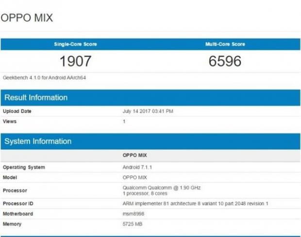 Về cấu hình phần cứng, dựa vào hình ảnh rò rỉ từ cơ sở dữ liệu Geekbench thì OPPO Mix sẽ được trang bị vi xử lý mạnh mẽ nhất của Qualcomm ở thời điểm hiện tại là Snapdragon 835, RAM 6GB và hoạt động trên nền tảng Android 7.1.1 Nougat. Ngoài ra, nguồn tin này còn cho biết OPPO Mix còn sở hữu thêm nhiều tính năng cao cấp khác như công nghệ sạc nhanh VOOC của OPPO và công nghệ camera kép zoom quang 5x mà hãng công bố cách đây không lâu.