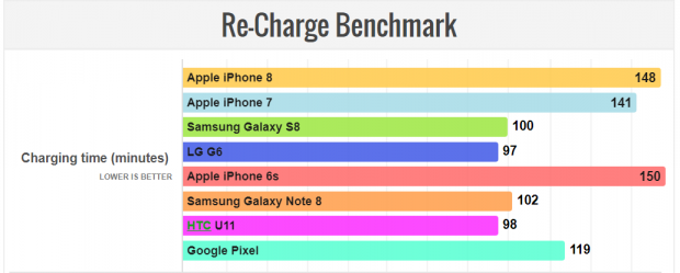 Theo như kết quả được đưa ra, thì iPhone 8 phải mất thời gian khá lâu để có thể nạp đầy pin: 148ph (gần 2h30ph).