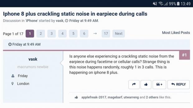 Theo những phản hồi từ người dùng iPhone 8 Plus, họ thường xuyên nghe phải những âm thanh 'rất phiền nhiễu' trong lúc thực hiện cuộc gọi thông thường. Và chỉ khi sử dụng tai nghe hoặc bật loa ngoài thì tiếng ồn khó hiểu này mới biến mất.