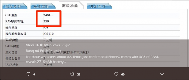 Ngoài ra, TENAA cũng xác nhận rằng chip Apple A11 Bonic trên iPhone X sẽ có tốc độ 2.4 GHz và dung lượng RAM của thiết bị này sẽ là 3GB, đúng như các tin đồn trước đây.