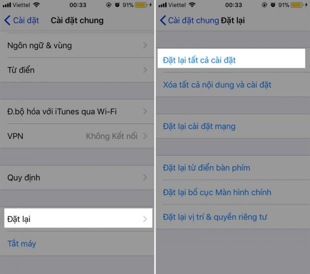 Truy cập vào Cài đặt > Cài đặt chung > Đặt lại > Đặt lại tất cả cài đặt.