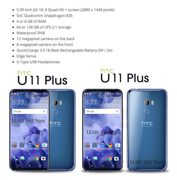 Về cấu hình, HTC U11 Plus sở hữu màn hình kích thước 5.99 inch, độ phân giải Quad-HD+ (2.880 x 1.440 pixels). Bên trong, máy sẽ được trang bị vi xử lý Snapdragon 835, dung lượng RAM 4GB/ 6GB, bộ nhớ trong 64GB/ 128GB cùng bộ đôi camera 12MP/ 8MP.