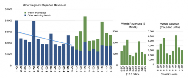 Asymco ước tính rằng trong 12 tháng qua đã có 15 triệu chiếc Apple Watch đến tay người dùng, giá trung bình mỗi chiếc là 330 USD, đã nâng doanh thu lên mức 4,9 tỷ USD.