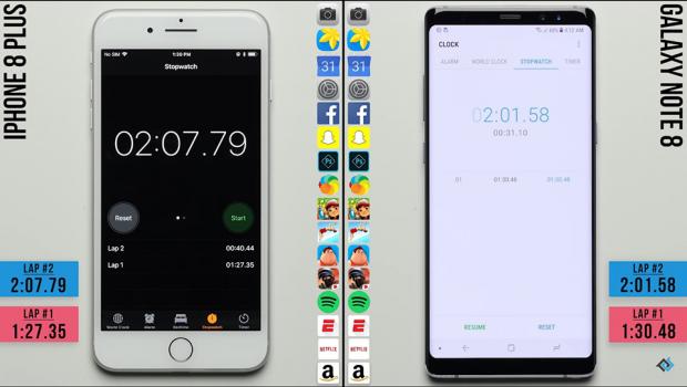 Kết quả cho thấy ở phần thi load ứng dụng, Galaxy Note 8 nhanh chóng dẫn trước. Nhưng sau khoảng 9 ứng dụng đầu tiên, iPhone 8 Plus đã đuổi kịp và vượt lên ở vòng đầu tiên với khoảng cách 3 giây so với đối thủ.