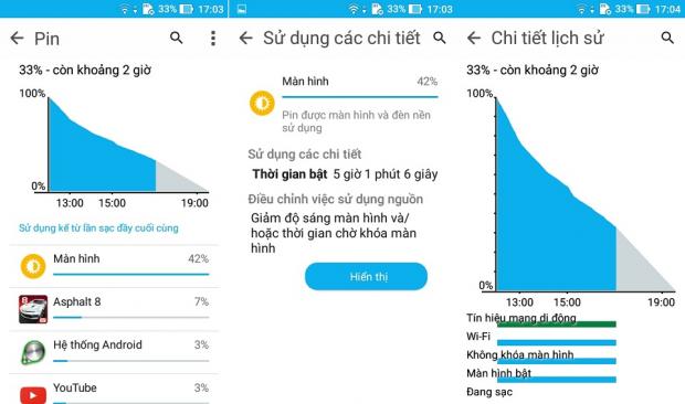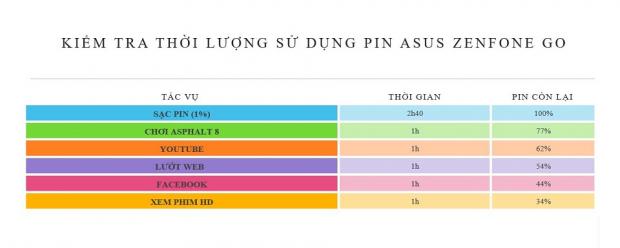 Được trang bị một viên pin chỉ 2.100 mAh nhưng Zenfone Go Plus lại cho thời gian sử dụng pin cực ấn tượng. Có thể lý giải điều này bằng việc máy có màn hình độ phân giải không cao và độ sáng ở mức trung bình nên sẽ phần nào giảm bớt gánh nặng về pin trong các tác vụ mà mình sử dụng. Kết quả cực kì ấn tượng với 65% pin được tiêu thụ sau khi sử dụng 5h liên tục màn hình sáng qua nhiều tác vụ không hề nhẹ nhàng. Một con mà không phải điện thoại nào dưới 2 triệu cũng có được vì thường các smartphone giá rẻ thì lại không được chú trọng nhiều khoản này.