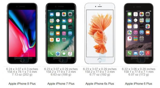 Bức ảnh phía trên được PhoneArena dựng lại dựa theo tỉ lệ đối chiếu kích thước thật ngoài đời của iPhone 8 Plus, iPhone 7 Plus, iPhone 6s Plus và iPhone 6 Plus. Bạn có thể thấy rằng gần như không có sự chênh lệch nào đáng kể. Tuy nhiên, mọi việc sẽ khác khi đặt iPhone 8 Plus cạnh Galaxy Note8.