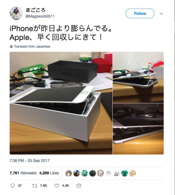 Một khách hàng thứ hai đến từ Nhật Bản đã chia sẻ một bức ảnh chiếc iPhone 8 Plus với màn hình hiển thị cũng bị bung nhẹ. Trong cả hai trường hợp, có vẻ như iPhone 8 Plus của 2 vị khách hàng này đã gặp phải vấn đề về pin.