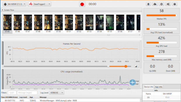 Galaxy Note8 tiếp tục thách thức các tựa game có đồ họa khủng. Với 3 game: Asphalt 8, Mortal Kombat và Dead Trigger 2 đều được đặt theo setting mặc định (Max cấu hình) thì Note8 dường như không có hiện tượng tuột khung hình đáng kể. Ở những phân cảnh có nhiều hành động và chi tiết đồ họa cao hầu như không có hiện tượng giật lag. Nhiệt độ của máy cũng tăng lên trong quá trình trải nghiệm 3 game nhưng không ảnh hưởng nhiều tới trải nghiệm, Galaxy Note8 cũng hạ nhiệt nhanh chóng sau khi hoàn tất bài test này. Kết quả từ Gamebench test 3 tựa game bên dưới: