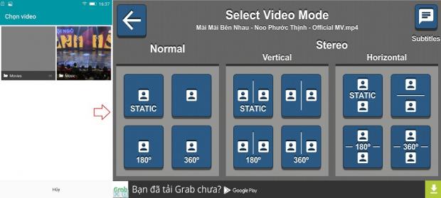 Sau khi chọn 1 video, sẽ có giao diện tiếp theo như hình. Ở đây, bạn có thể chọn các cách hiển thị theo chiều ngang hoặc dọc, âm thanh đi ra là binh thường hay âm thanh nổi... Và chắc chắn là có tùy chọn xem 360 độ.