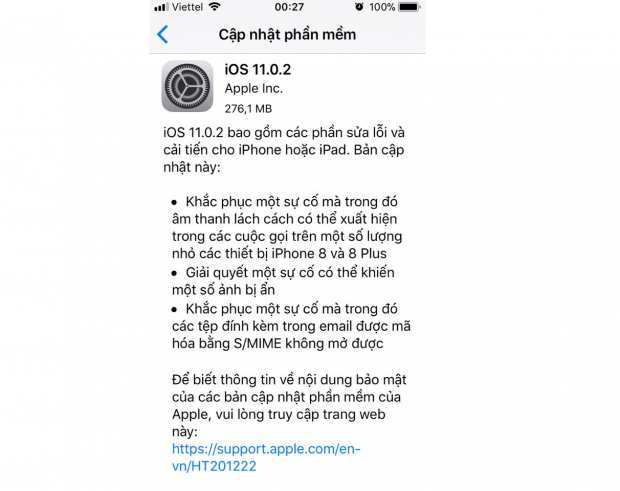 Nổi bật nhất trong bản cập nhật 11.0.2 lần này, chính là việc Apple đã khắc phục hoàn toàn lỗi âm thanh khi nghe gọi điện thoại trên chiếc iPhone 8 mới ra mắt gần đây. Bên cạnh đó một số sự cố như ảnh bị ẩn trong thư viện, không mở được tệp đính kèm trong các email cũng được Apple khắc phục hoàn toàn.