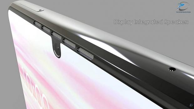 Cảm biến vân tay theo mẫu concept này cũng được đưa xuống dưới màn hình, vị trí đặt camera trước được khoét một lỗ nhỏ ở cạnh trên màn hình. Thân máy sử dụng khung kim loại chắc chắn, camera kép 16MP phía sau và có thể quay phim với tỷ lệ 18 : 9 như tỷ lệ mà hình của máy.