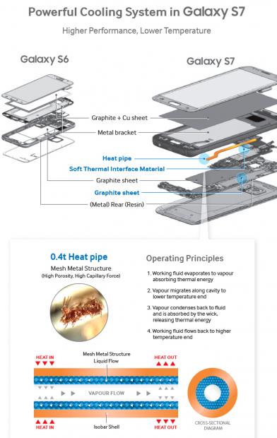 Phần ống dẫn nhiệt bao quanh khu vực CPU/GPU, phần nóng nhất khi ta sử dụng một chiếc điện thoại. Bên trong ống dẫn nhiệt có một lượng chất lỏng. Lượng chất lỏng tỏa đều khi máy quá nóng và đến một lượng nhiệt nhất định, nó sẽ bốc hơi. Sau quá trình bốc hơi, lượng chất lỏng ngưng tụ và lại tiếp tục quá trình làm mát máy. Đại diện Samsung cho biết hệ thống làm mát này sẽ giúp cho Galaxy S7 không bao giờ rơi vào tình trạng quá nóng. Họ còn ví dải tản nhiệt trong S7 có tác dụng giống như một đường cao tốc khi tham gia giao thông.