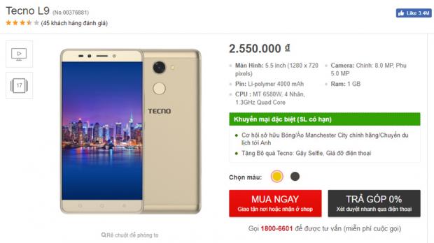 Smartphone TECNO L9 là sản phẩm thuộc phân khúc giá rẻ chỉ hơn 2 triệu đồng xuất xứ từ Hong Kong. TECNO L9 nổi bật nhờ màn hình lớn 5.5 inch, cảm biến vân tay một chạm, viên pin “khủng' 4,000 mAh. Hơn nữa, đây là thời điểm tốt nhất để sở hữu TECNO L9 với nhiều ưu đãi cực kỳ hấp dẫn!