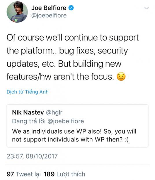 Ông Joe Belfiore, Phó Chủ tịch của tập đoàn Microsoft trong mảng Windows gửi thông điệp đến người dùng rằng: Ông đã chuyển sang mảng Android và Windows 10 Mobile không còn là trọng tâm của Microsoft trong thời gian tới.