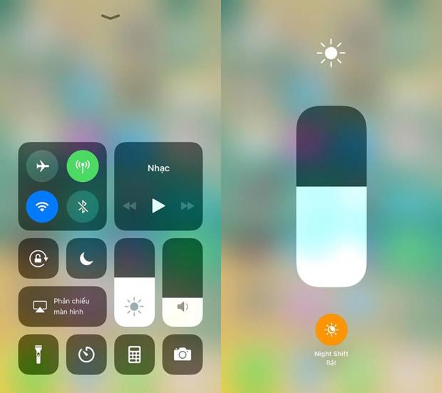 Bạn chỉ cần vuốt thanh Control Center lên và bấm 3D Touch hoặc giữ một lúc trên thanh điều chỉnh độ sáng thì nút Night Shift sẽ hiện ra ở dưới cuối màn hình.