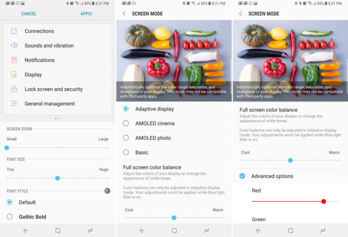 Galaxy Note8 sở hữu màn hình đẹp nhất trong số các flagship, với màn hình Note8, bạn có thể tùy chỉnh lại màu sắc theo ý thích của mình. Để đặt lại màu sắc của màn hình, bạn truy cập vào Cài đặt, chọn Display/ Screen mode. Tại đây các tùy chọn sẽ được hiện ra và bạn trượt các thanh màu theo ý mình.