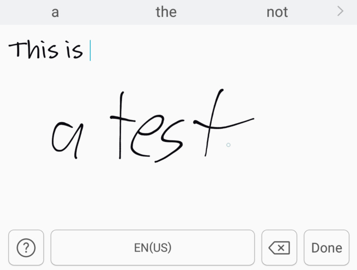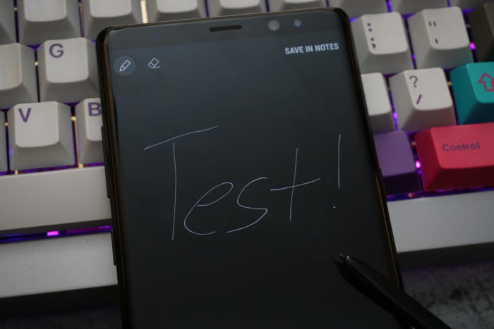 Samsung Galaxy Note8 được hãng trang bị khả năng nhận diện chữ viết tay khá tốt. Cụ thể, hệ thống sẽ dịch những chữ viết tay thành các ký tự số. Theo đó, nhiệm vụ của bạn là lấy bút S Pen ra, di vào nó một cụm từ ngẫu nhiên, chọn biểu towngj màu xanh hiện ra là bạn đã có thể thấy được bàn nhập liệu bằng S Pen rồi.