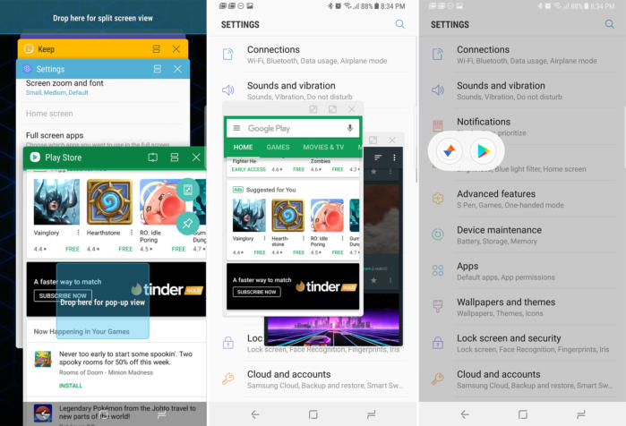 Note8 có lợi thế là màn hình to nên đa nhiệm cũng trở nên dễ dàng hơn. Theo đó, người dùng có thể mở một cửa sổ ứng dụng ở chế độ thu nhỏ lồng lên trên một ứng dụng khác. Muốn thực hiện điều này, bạn hãy bật danh sách ứng dụng đang chạy, nhấn giữ vào ứng dụng mà bạn muốn đưa vào chế độ cửa sổ và thả tay ra là xong.