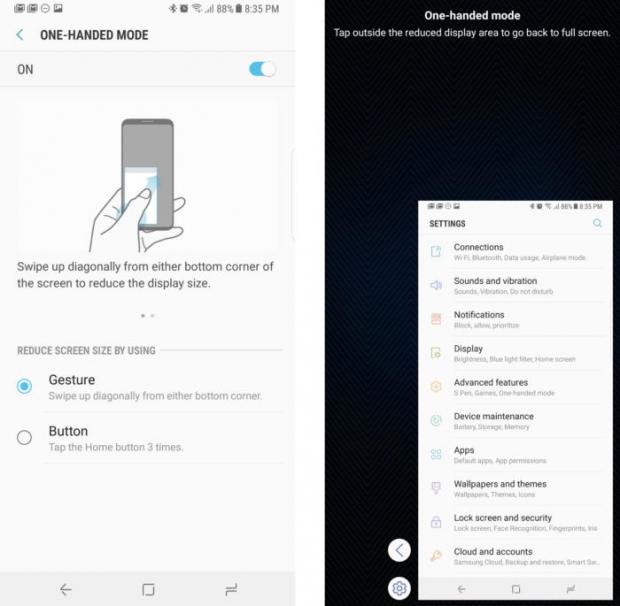 Note8 là chiếc smartphone có kích thước lớn, vì vậy Samsung đã tính hợp tính năng cho phép người dùng sử dụng bằng một tay. Để kích hoạt tính năng này, người dùng truy cập vào Settings/ Advanced/ Features/ One-handed mode sẽ hiện ra 2 tùy chọn để người dùng kích hoạt chế độ rảnh tay bao gồm gồm Gesture (kích hoạt bằng cách vuốt ngón tay chéo từ góc màn hình) và Button (nhấn nút Home 3 lần).
