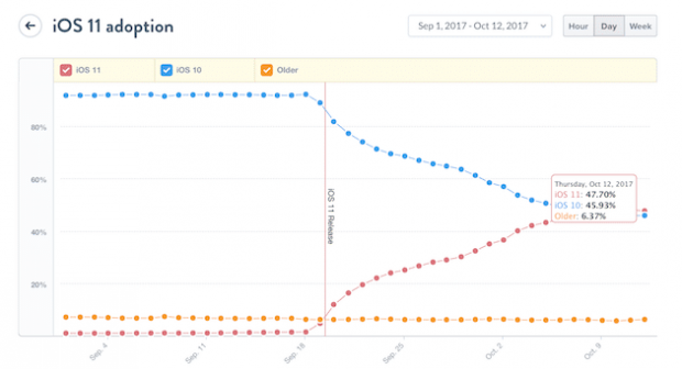 Một tuần sau khi chính thức có iOS 11 thì cũng chỉ có 25% số người dùng nâng cấp lên iOS 11, một con số khá khiêm tốn. Và tới thời điểm hiện tại thì iOS 11 đã đạt tới phiên bản 11.0.3 và 11.1 Beta 2 qua đó cũng đánh dấu cột mốc quan trọng là đã có khoảng 47% người dùng nâng cấp lên hệ điều hành mới này.
