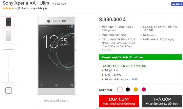 Hiện tại trên hệ thống bán lẻ , Xperia XA1 Ultra đang được hạ giá mạnh mẽ từ 8.99 triệu xuống chỉ còn 7.99 triệu đồng, hạ 1 triệu đồng. Lưu ý chương trình này sẽ áp dụng tới ngày 23/10 với số lượng có hạn nhé.