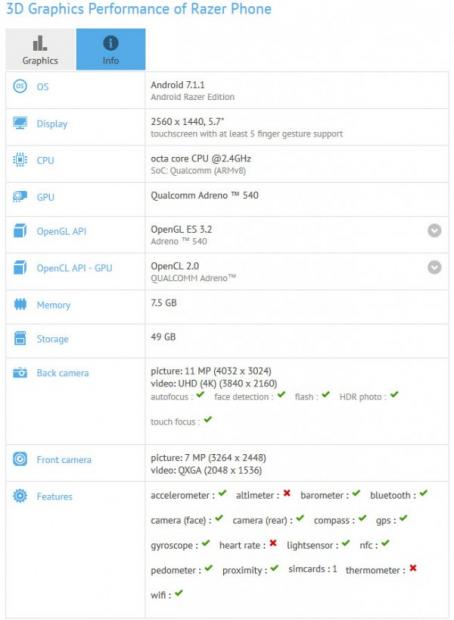Phải vài tuần nữa Razer mới chính thức công bố mẫu smartphone đầu tiên của hãng, nhưng hiện tại đã xuất hiện khá nhiều thông tin rò rỉ xoay quanh chiếc điện thoại này. Và mới đây, trang đo điểm chuẩn nổi tiếng GFXBench bất ngờ đăng tải một danh sách các chi tiết về thông số, cấu hình của một thiết bị có tên gọi là “Razer phone”.