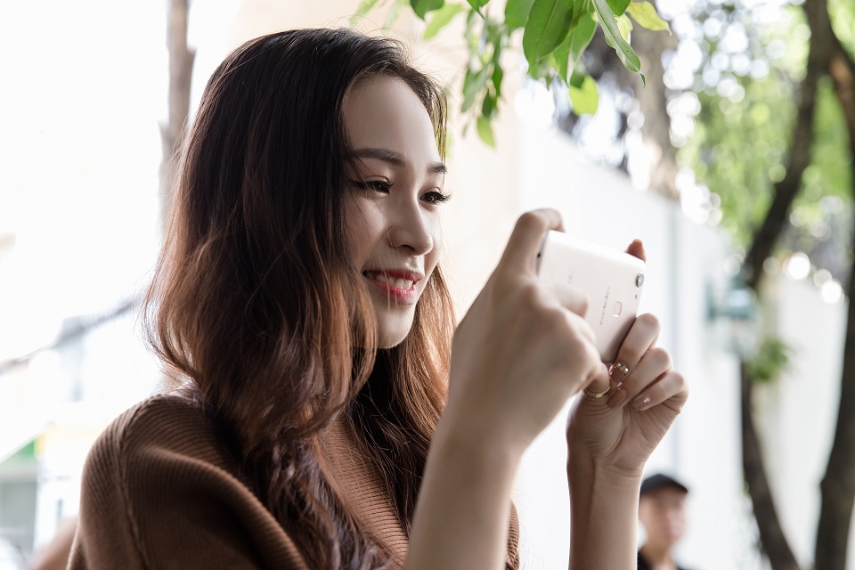 OPPO F5 phiên bản màu vàng kim.được thí sinh thi HHHV cầm và sử dụng