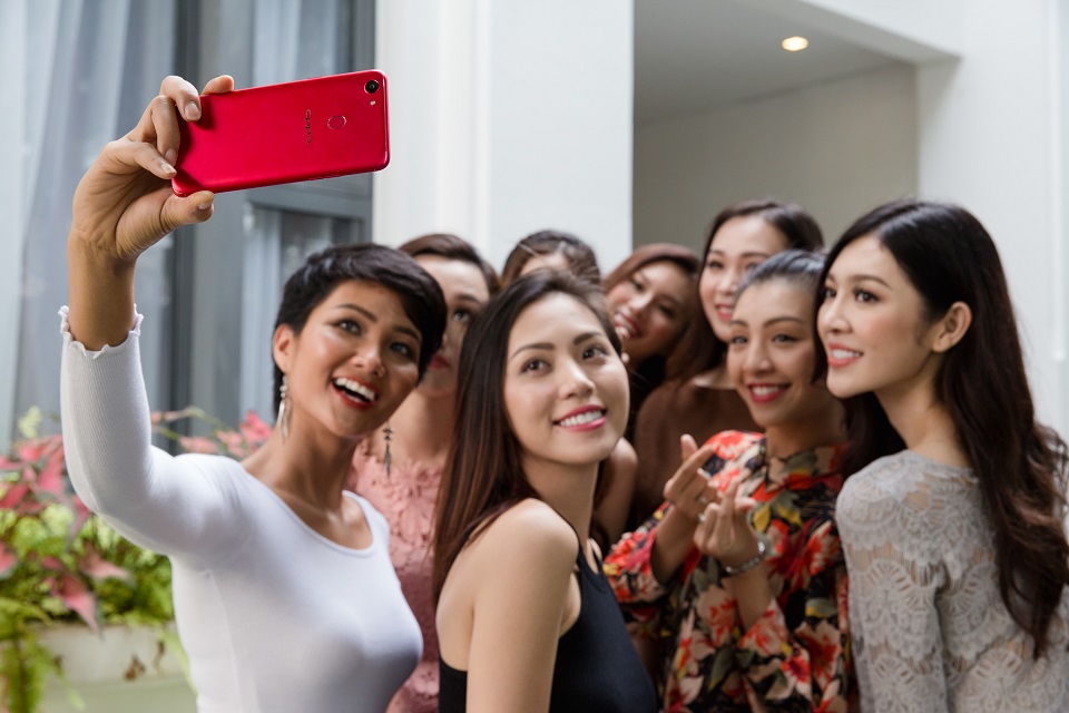 Hai cô gái xinh đẹp hào hứng selfie với OPPO F5 Red