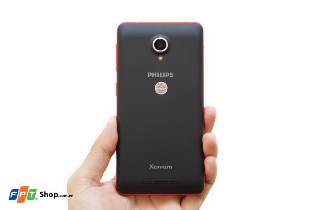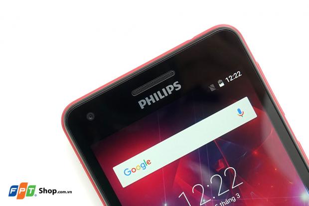 Ở phía trên màn hình là camera selfie, dải loa thoại, cảm biến tiệm cận và một logo Philips màu sáng bạc.