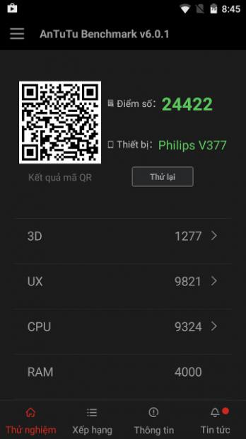 Đánh giá bằng ứng dụng Antutu Benchmark, Philips V377 đạt kết quả hơn 24000 điểm.