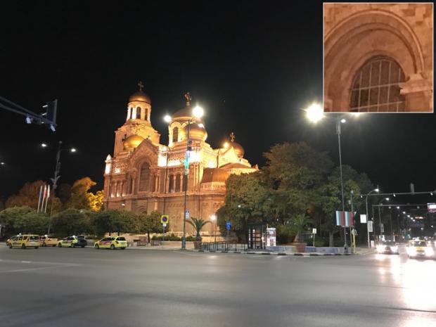 Khi thử với chế độ chụp không flash ban đêm, iPhone 8 Plus vẫn thể hiện được màu sắc sống động. Khi quan sát phần cột đèn cao áp, phần tia sáng được bo tròn gọn gàn thay vì phát ra như trên ảnh của iPhone 7 Plus. Điều này cho thấy khả năng xử lý từng phần trên ảnh của iPhone 8 Plus.