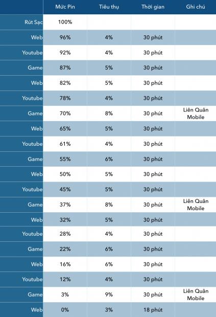 - Thử mỗi tác vụ trong 30 phút đến khi hết pin bao gồm: lướt web (web + chat + fb + đọc báo), xem Youtube, chơi game (Asphalt 8, Liên Quân Mobile), sử dụng tất cả bằng Wifi.