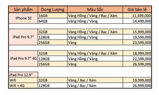 Giá bán này được cho là sẽ áp dụng tại hệ thống đại lý FPT. Ngoài iPhone SE, giá bán dành cho iPad Pro 9.7 inch cũng được tiết lộ với giá rẻ nhất từ 16 triệu đồng. Được biết, iPhone SE và iPad Pro 9.7 inch sẽ bắt đầu cho phép người dùng nhận đặt hàng từ ngày mai tức 29/5. 2 thiết bị di động mới nhất từ Apple sẽ bắt đầu được bán rộng rãi trên các đại lý từ đầu tháng 5.