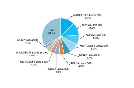 Theo đó, thị phần của Lumia 535 hiện tại là 12,5%, xếp thứ 2 là Nokia Lumia 520 với 11,3%. Ba mẫu smartphone giá rẻ khác của Microsoft gồm Lumia 630, Lumia 640 và Lumia 635 lần lượt chia đều vị trí thứ 3, 4, 5 với thị phần lần lượt là 8,3%, 8,3% và 6,3%.