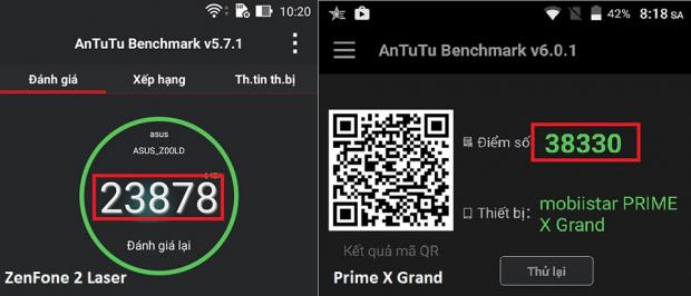 Ngoài việc trang bị bộ nhớ trong 16 GB và đều tích hợp khe cắm thẻ nhớ mở rộng dung lượng, Zenfone 2 Laser chỉ được sở hữu bộ vi xử lý lõi tứ Snapdragon 410, chip đồ họa GPU Adreno 306, RAM 2 GB. Trong khi đó, Prime X Grand sử dụng bộ vi xử lý lõi tám MT6753, chip đồ họa GPU Mali-T720 MP3, RAM 3 GB. Đo hiệu năng bằng ứng dụng Antutu Benchmark, Zenfone Laser cho tổng số điểm đạt được 23.878, đối với Prime X Grand cao hơn hẳn với 38.330 điểm. Bước đầu cho thấy, sản phẩm đến từ thương hiệu smartphone Việt Mobiistar cho cấu hình cao hơn hẳn so với nhà sản xuất Asus. Chưa kể đến, Zenphone 2 Laser vẫn đang chạy hệ điều hành Android 5.0, đối với Prime X Grand đang ở phiên bản Android 5.1.
