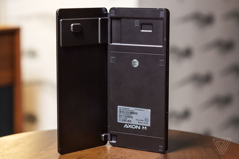 Phần mặt sau của ZTE Axon M tất nhiên không giống những điện thoại thông thường khác, nó bao gồm các gờ cạnh và các khớp nối. Những chi tiết này sẽ đảm bảo để khi gập máy hoàn toàn thì ZTE Axon M sẽ trở lại thành một chiếc điện thoại dạng thanh bình thường. Đồng thời mặt sau ZTE Axon M cũng không hề có sự xuất hiện của camera sau. ZTE Axon M chỉ có duy nhất camera trước thôi và nếu muốn chụp bằng camera sau thì bạn có thể sử dụng màn hình còn lại để chiếu những hình ảnh camera thu được lên, rất sáng tạo.