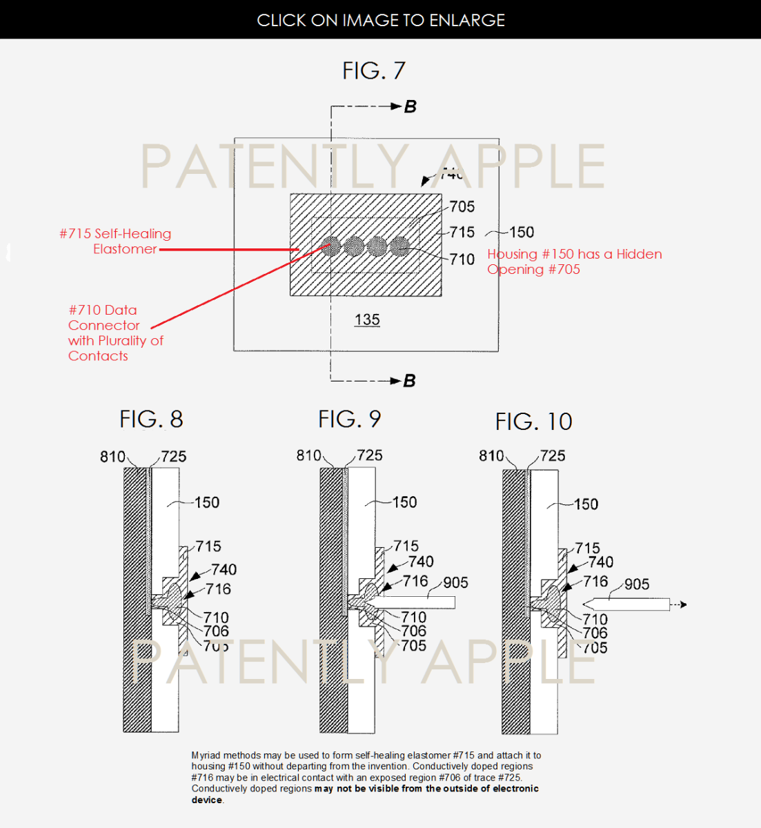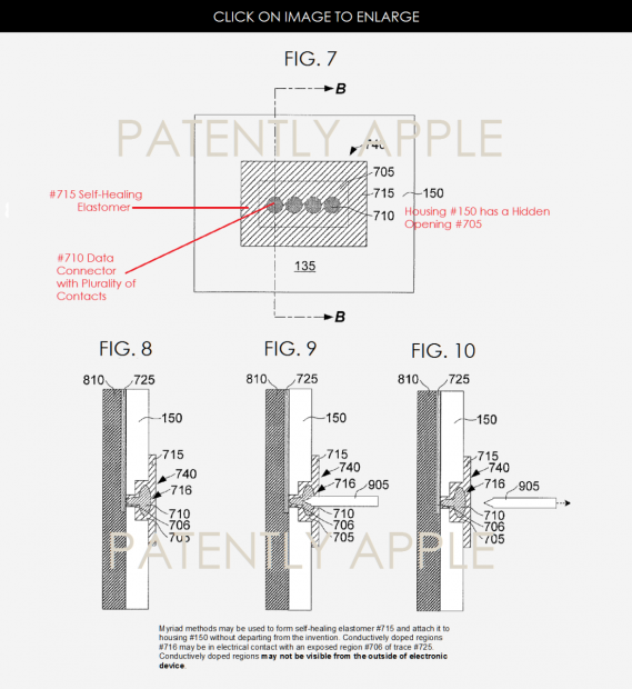 Bên cạnh đó, chúng ta còn thấy một số bằng sáng chế về vật liệu đàn hồi của Apple. Một hoặc nhiều đầu dò điện có thể tạm thời thâm nhập vào các chất đàn hồi tự liền để liên hệ với các đại chỉ liên lạc kết nối. Sau khi thăm dò điện được loại bỏ, các chất đàn hồi tự liền sẽ tự động liền lại như chưa có gì xảy ra.