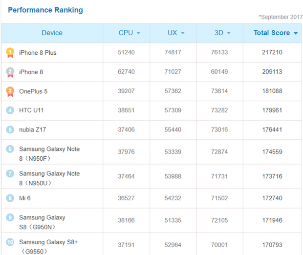 Mỗi tháng, AnTuTu đều tổng hợp một danh sách những smartphone mạnh nhất bao gồm cả hai hệ điều hành Android và iOS. Theo kết quả top 10 smartphone có hiệu năng mạnh mẽ trong tháng 9/2017 vừa qua, bộ đôi iPhone mới của Apple đã “lật ngược thế cờ” để vượt mặt những tay sừng sỏ nhất trên bảng xếp hạng Antutu Benchmark với số điểm lên tới không tưởng. Cụ thể, iPhone 8 Plus đoạt “ngôi vương” với số điểm 217,210 điểm, trong khi người anh em iPhone 8 ở vị trí thứ 2 với số điểm là 209,113 điểm. Đây là kết quả dễ dự đoán bởi con chip A11 Bionic thế hệ mới vượt trội trong thế giới smartphone hiện nay.